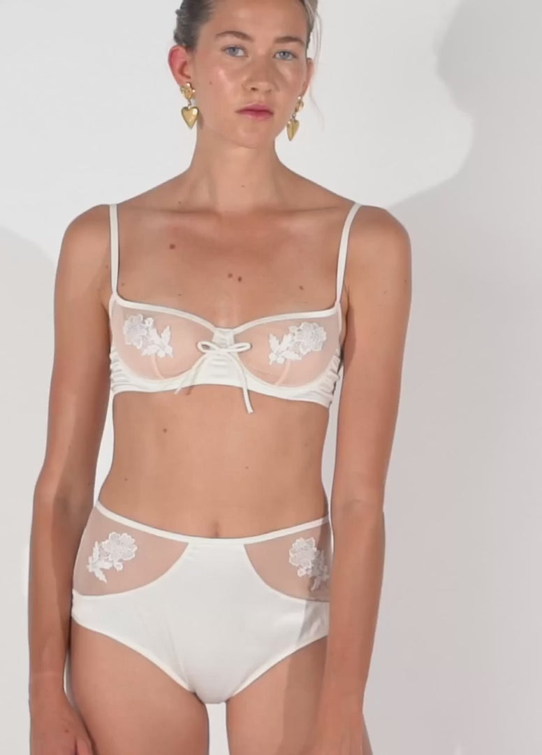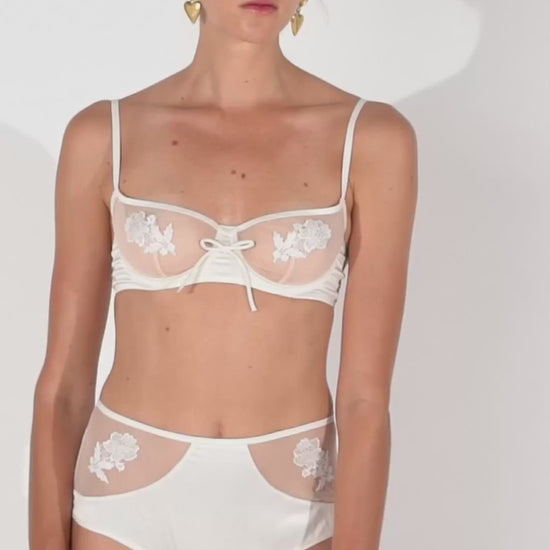 Balconcino push-up in raso elasticizzato. Coppe con motivo guipure floreale delicatamente cucito su tulle rigido. Parte anteriore foderata in raso e parte posteriore in tulle elastico per il sostegno. Fiocco di raso all'inguine e dettagli dorati sulle spalline.