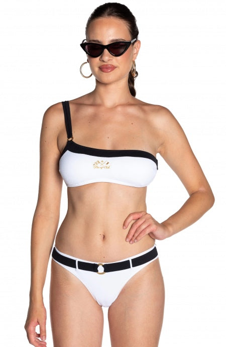 Bikini fascia monospalla bicolor in lycra piquet con imbottitura estraibile, ricamo oro light lamè e slip con cintura incorporata.